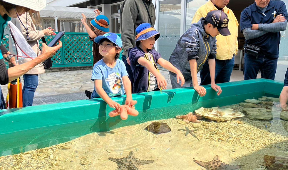 - タッチプールではサンゴやヒトデなど海の生き物に触ることができます。